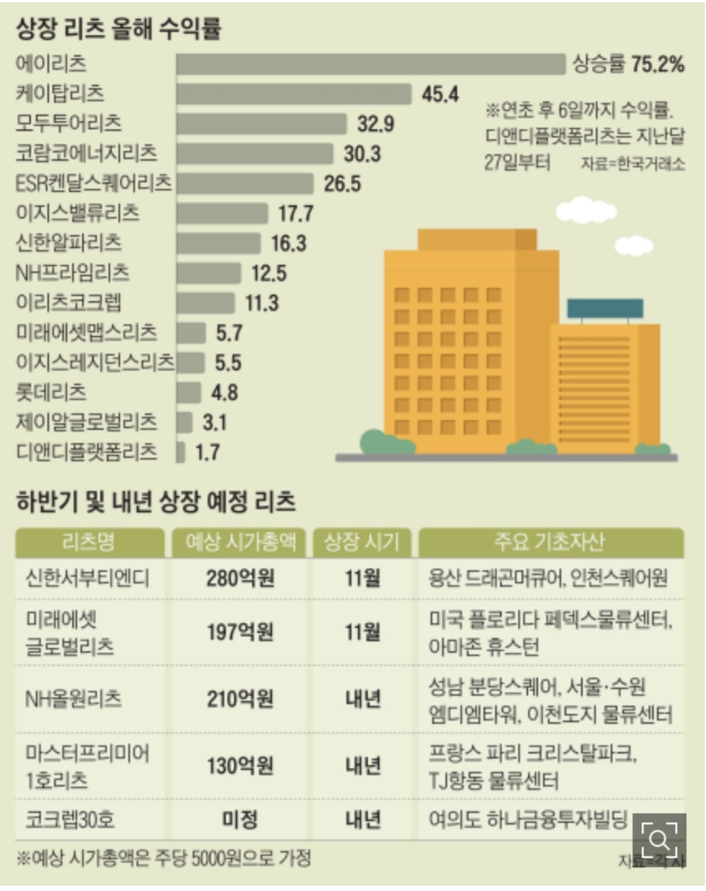 SK 리츠인 경우, SK서린빌딩과 SK주유소 100여 개 자산을 기초자산으로 하고, 고정 임대 계약으로 분기별 배당을 한다.