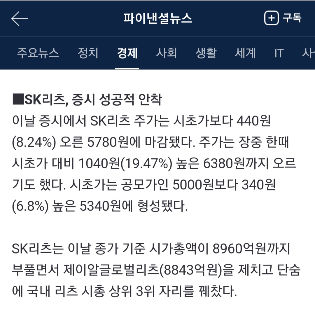 다수의 투자자에게 자금을 모아 부동산 투자한다. 발생하는 임대수익, 개발수익, 매각차익의 90%를 배당한다. 얼마 전 상장한 SK 리츠의 청약경쟁률은 552.01 : 1을 기록했고, 국내 리츠 시총 상위 3위를 기록했다.